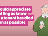 We realise that a relative or close friend’s death is difficult and emotional. We will be as sympathetic and supportive as possible during this bereavement period. However, we would appreciate you letting us know when a tenant has died as soon as possible. You will need to let us know the date of death and give details of the person dealing with the deceased’s estate. It would also help if you could let us know who will remove the deceased person’s belongings. The tenancy does not automatically end as soon as a tenant dies.